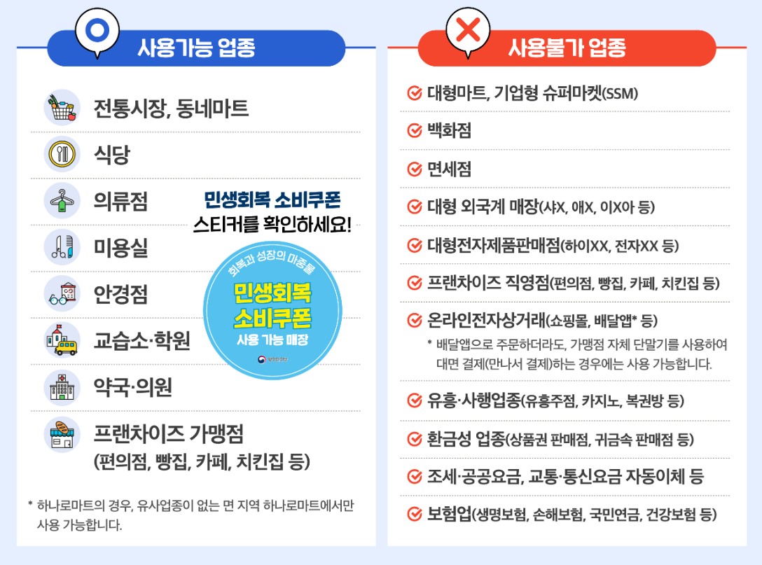 - 카드형 지원금 → 일반 가맹점 사용 가능, 불가 업종 자동 차단