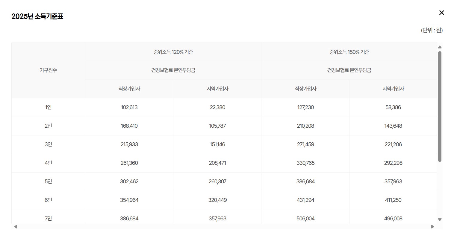 | 소득 기준 | 신규 신청자: 중위소득 150% 이하 기수혜자 재신청: 중위소득 120% 이하 |
