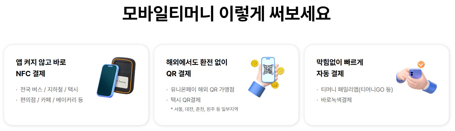 - 지갑 앱에서 티머니 선불카드 등록 후 단말기 터치만으로 사용 가능, 실물 카드 불필요