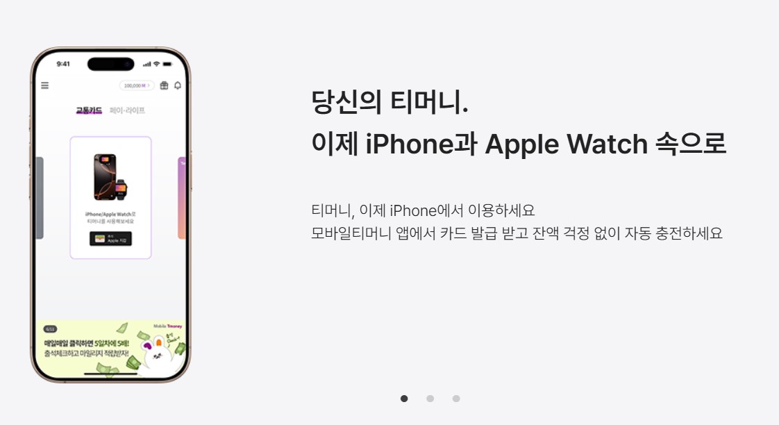 - iPhone Xs/XR 이후 모델 및 Apple Watch Series 6/SE 2 이상에서 티머니 선불카드 등록 및 결제 가능