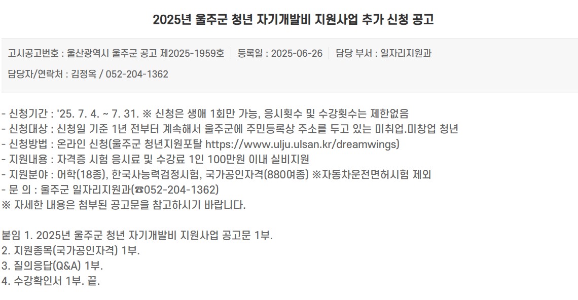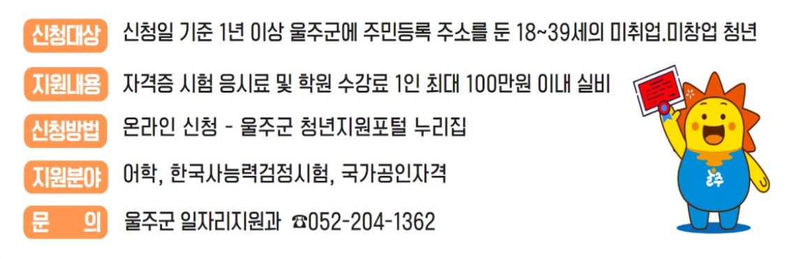 많은 청년들이 지원받아 취업 경쟁력을 높이고, 희망을 이루는 계기가 되길 바랍니다. 궁금한 점이 있다면 울주군 일자리지원과(☎052-204-1362)로 문의할 수 있습니다. 😊