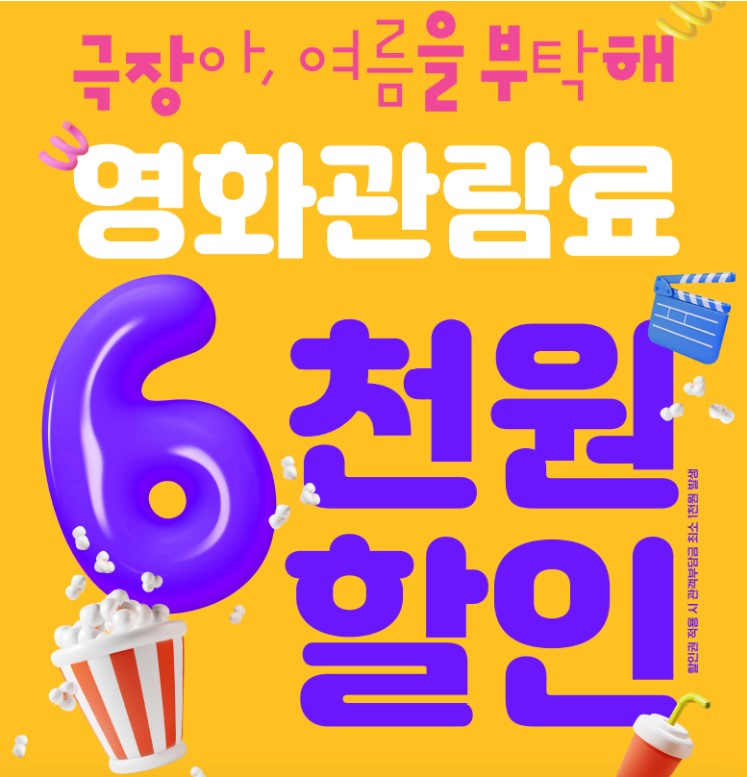 - '문화가 있는 날'과 꿀조합!: 매달 마지막 수요일인 '문화가 있는 날'에는 영화 관람료가 7천 원으로 할인되는데, 여기에 6천 원 할인권을 적용하면 단돈 1천 원에 영화를 즐기실 수 있습니다!