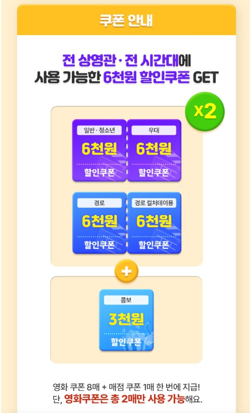 - 일반·특별관 관계없이 정가에서 무조건 6,000원 할인 적용됩니다.