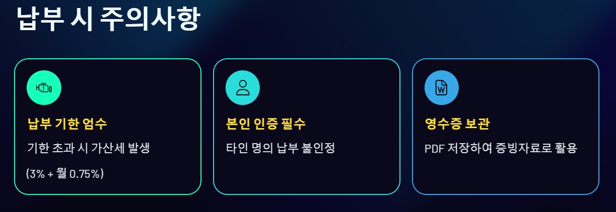 - ⏱️ 납부 기한 초과 시 가산세 발생 (3% + 월 0.75%)