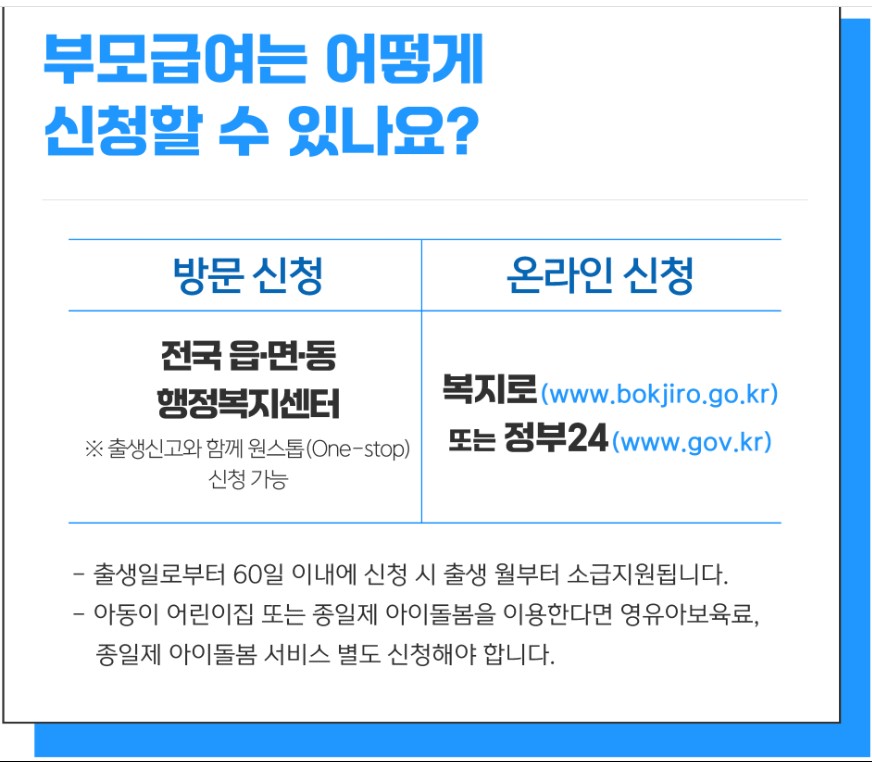 - 경로: 복지로 또는 정부24 → 부모급여 신청