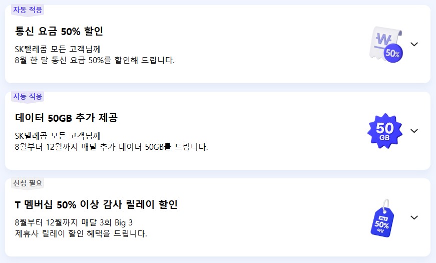- 통신 요금 50% 할인: 8월 한 달치 (기본료+데이터+통화)
