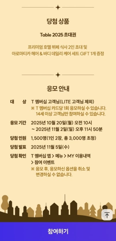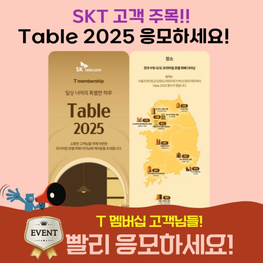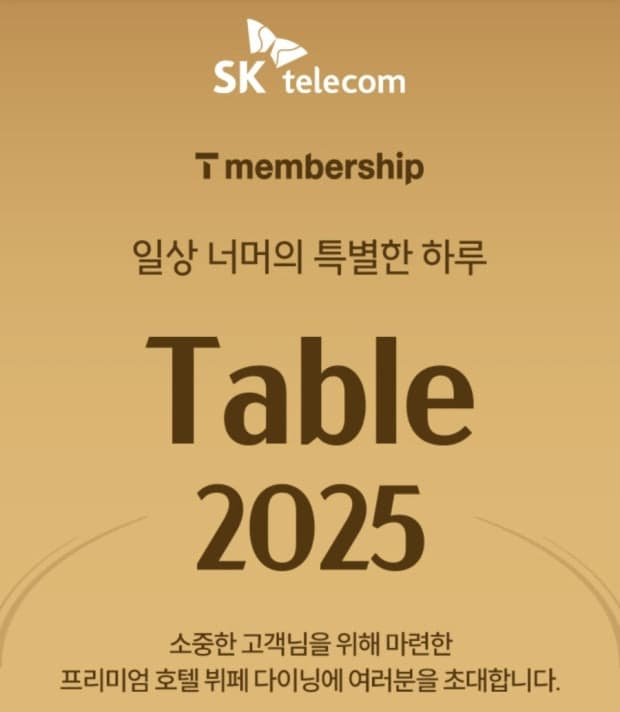 Table 2025는 SKT 고객에게 통신 혜택을 넘어 **프리미엄 호텔뷔페 미식 체험**을 선사하는 특별한 기회입니다. 응모 기간을 놓치지 말고 T멤버십 앱에서 빠르게 신청해보세요. 연말, 기억에 남을 한 끼와 즐거운 시간을 기대해보셔도 좋습니다!